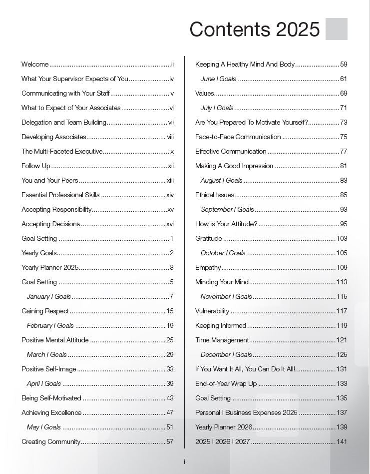 We make it simple! The two-page introduction included in THE TOTAL EXECUTIVE® 2025 is a simple guide to goal setting designed to help you identify and set both long-term and short-term goals. In addition, we help you establish a goal setting plan to help you achieve goals on a daily, weekly, monthly, and yearly basis.